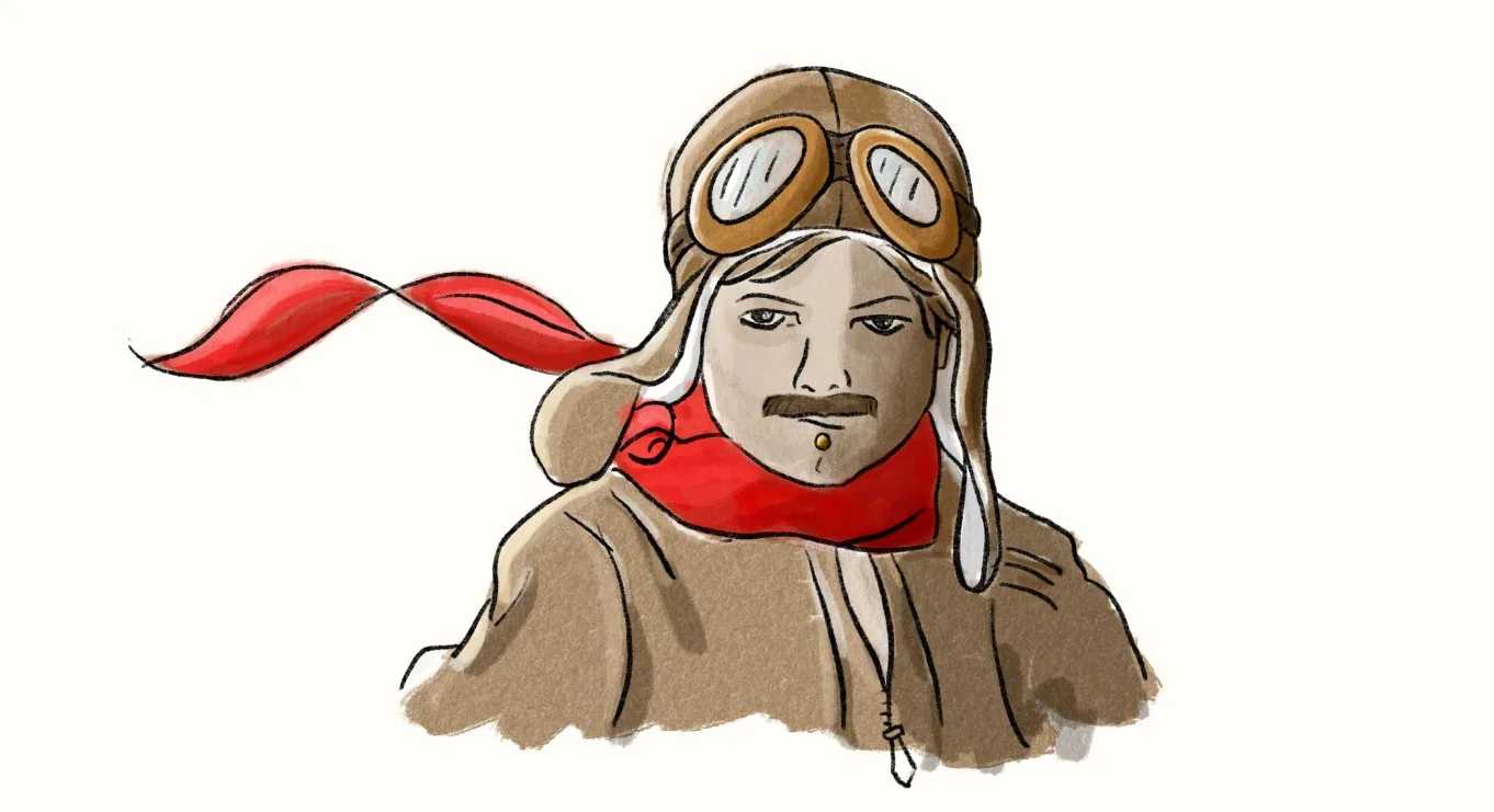 Head-to-toe, I’m donning the full flight apparatus. The leather aviator helmet with glasses, long leather coat, riding-style breeches, boots, fake mustache, and of course the famous blood-red silk scarf. Incidentally, the scarf was used to protect a pilot’s neck from chaffing as they scanned the skies in search of enemy planes.