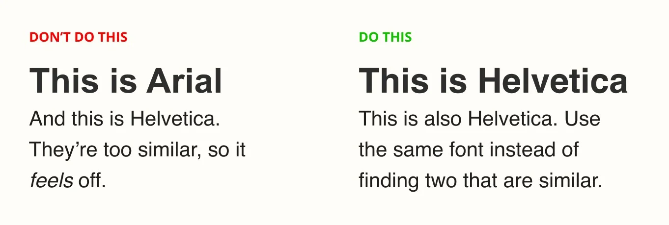 If you need to combine typefaces, (I recommend #1 again) don’t use two that look similar like Helvetica and Arial. This confuses the reader because something looks off. But they can’t quite figure it out.