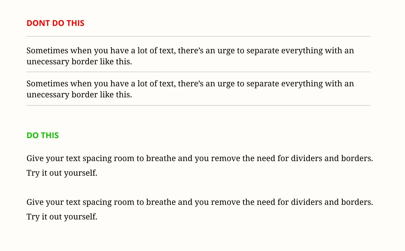 Stop. This is why we can use spacing and padding to achieve an invisible border. By adding a little bit of extra spacing, it gives the illusion of a border.